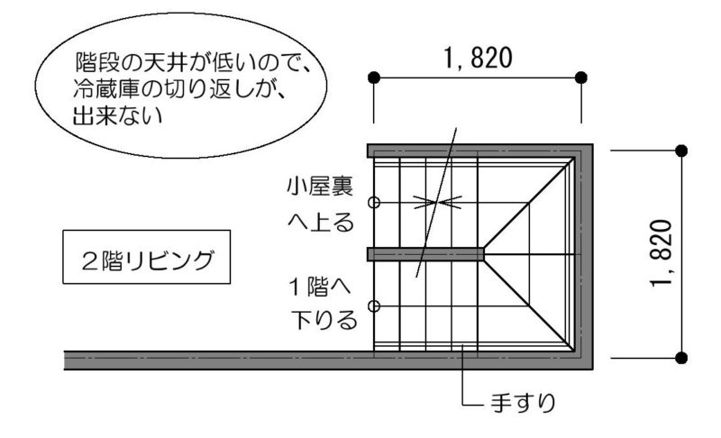 2階から小屋裏や3階へいく階段がある場合、階段部分の天井が低くなるので、 頭があたってしまい冷蔵庫が搬入できない場合があります。