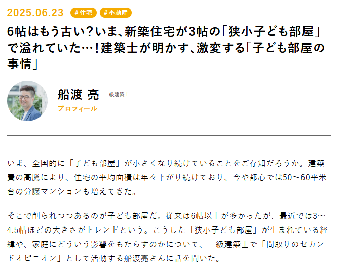 【250623】現代ビジネスの取材記事が公開されました! 2025 6/23 メディア 告知 2025年6月23日 WEBメディア 現代ビジネスの「子供部屋」に関する取材記事が公開されました! ▶建築士が明かす、激変する「子ども部屋の事情」 現在ビジネスでは、このほか、19本の取材記事が公開されています。 メディア 告知 よかったらシェアしてね! URLをコピーしました! URLをコピーしました! 【250618】銀行公式アプリ「Wallet+」に執筆記事5本が掲載されました! 【280701】with classの取材記事が公開されました! この記事を書いた人 akira 家づくりを通して、ライフスタイルをデザインして欲しい、という思いから、このブログを立ち上げました。二児の父でもあり、家事もバリバリこなすイクメンです。 一級建築士 / インテリアコーディネーター 関連記事 【250722】不動産スキルセット後編が公開されました! 2025年7月23日 【250717】雑誌DIME10月号に書評が掲載されました 2025年7月17日 【250710】PIVOT 不動産スキルセットに出演しました! 2025年7月11日 【280701】with classの取材記事が公開されました! 2025年7月1日 【250618】銀行公式アプリ「Wallet+」に執筆記事5本が掲載されました! 2025年6月18日 【250608】ABEMA「秘密のママ園」に講師として出演しました! 2025年6月9日 【250509】リアルサウンドブックの取材記事が公開されました 2025年5月9日 【250304】「カズレーザーと学ぶ」に出演しました! 2025年3月1日