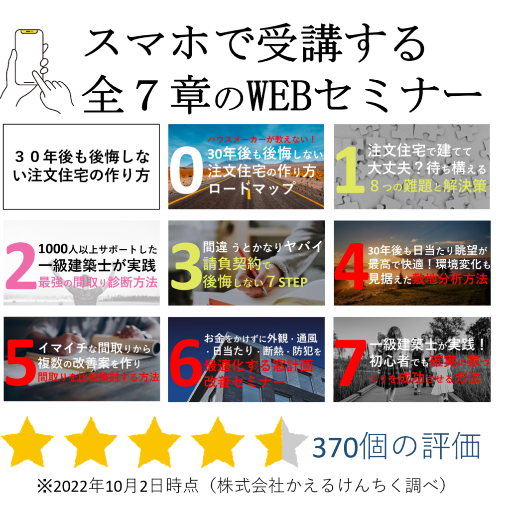 1000人以上の間取り診断・家づくりサポートした著者が、注文住宅を建てる施主が必ず知っておくべきだと思わる知識を7章の動画講座にまとめました。